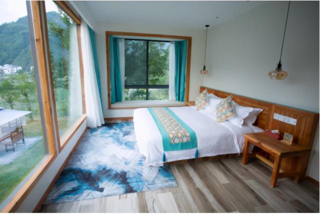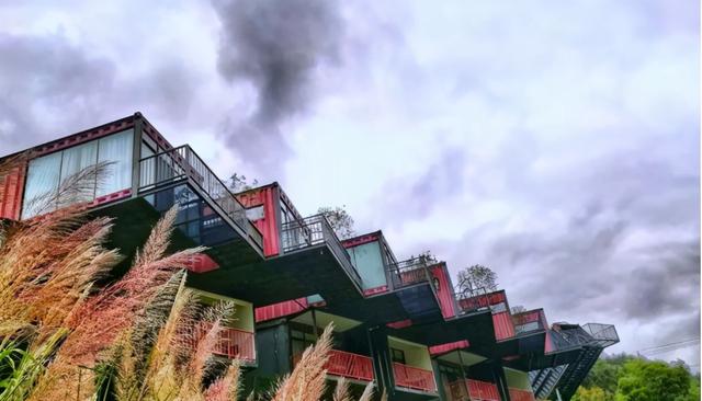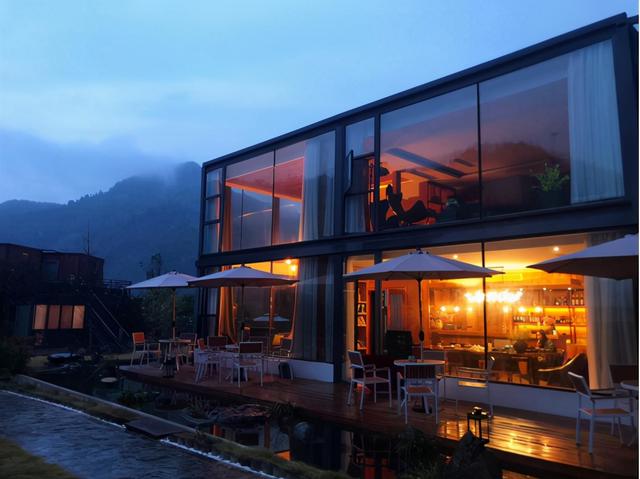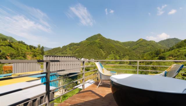 獨(dú)特集裝箱建筑坐落于美妙的山水之間,房間露天陽(yáng)臺(tái)正對(duì)著外面的大山和流水,晚上能聽(tīng)到靜靜地流水聲,落地大窗戶,躺在床上就能看到遠(yuǎn)處的風(fēng)景。