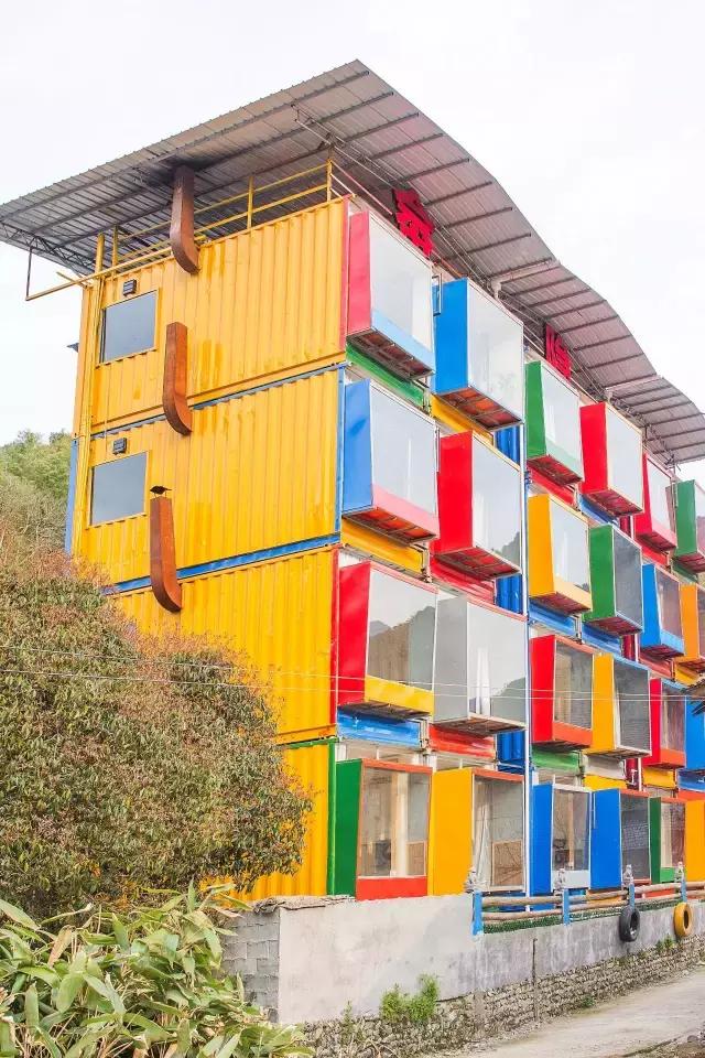 初見畬隱就有一種驚艷的感覺,畬隱的客房由12個(gè)集裝箱組成,外表被涂成七色彩虹,遠(yuǎn)遠(yuǎn)望去猶如架在山水田園間的彩虹橋,達(dá)到了工業(yè)風(fēng)和田園風(fēng)的完美結(jié)合。