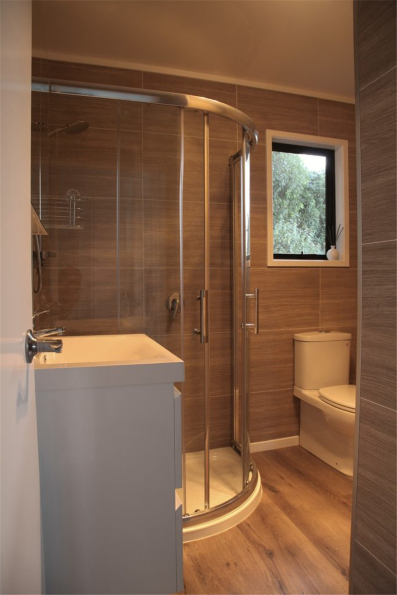 主臥室和起居區的寬度為1.5個容器,比單寬度模型具有更多的空間。除了主臥室,房屋內還有一個空置的次臥。為了增加防潮效果,衛浴間的墻面和地板都貼上了瓷磚,整體空間比較小巧。