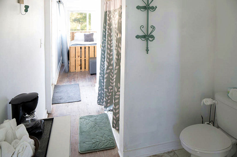 這是位于二樓的房間,木制的床顯得尤為親切溫暖,床頭及床邊開了窗戶,足不出戶就能欣賞外部的自然景觀。浴室和衛生間位于房間的另一頭,由白墻和浴簾隔開,空間雖小,設施齊全。