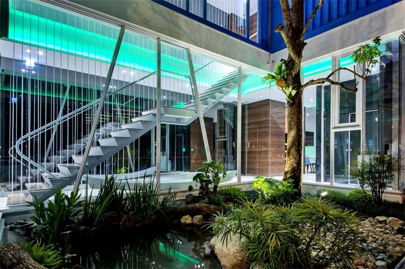 看到如此熟悉的紋路,就應(yīng)該知道這又是一家集裝箱改造而成的三層建筑了。然而事實(shí)是建筑的外表僅以集裝箱鐵皮作為裝飾,實(shí)則為鋼骨結(jié)構(gòu)。外觀以藍(lán)白為主,形似一艘大船停泊在路邊。