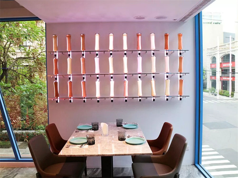 一樓主要為落地玻璃的透光設(shè)計,靠墻一邊的天花是片狀材料拼成的水滴型裝飾,極具現(xiàn)代感和藝術(shù)線條美,讓環(huán)境瞬間變得高大上起來,引起視覺上的愉悅,有利于顧客用餐心情。