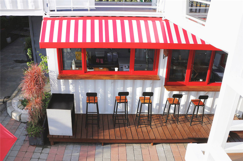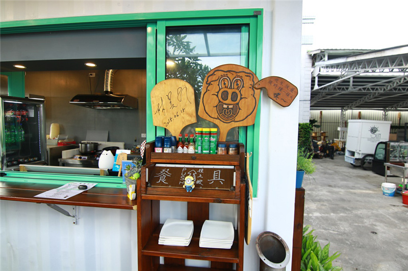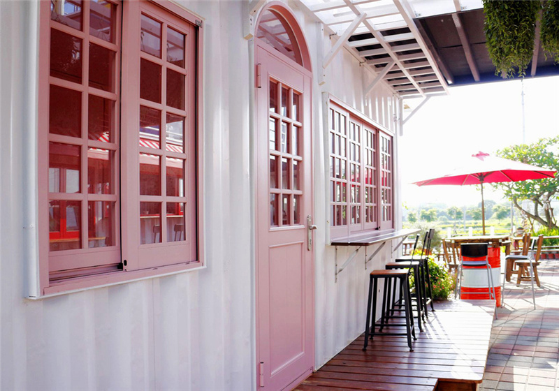 黑色箱是咖啡店、紅色箱是【蝦餃貨水餃鍋貼專賣】,而粉色箱則是甜點店。粉色的鐵窗和鐵門為少女們打造了一個夢幻甜美的小屋,柔化了集裝箱的工業(yè)剛性,由此組成了一個創(chuàng)意十足的文創(chuàng)園。