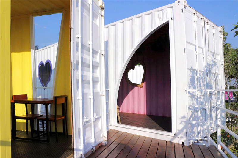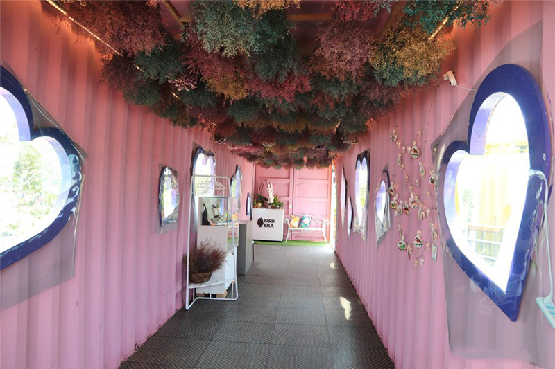最特別的要數(shù)這個“心形窗”的集裝箱,位于二層的它擁有絕佳的地理優(yōu)勢。室內(nèi)被全部漆成粉紅色,天花上掛滿了干花,打造了一個宛如“花路”的通道,成為少女游客的必打卡點。