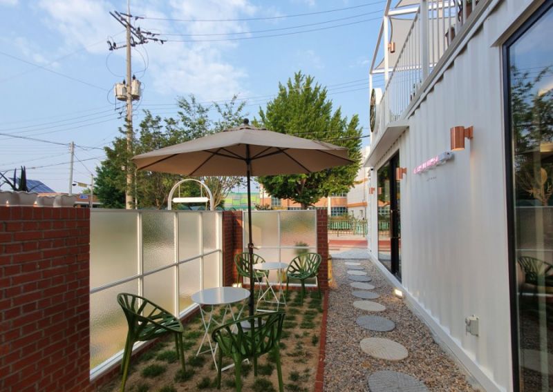 由多個集裝箱模塊共同構建而成,這是一座兩層的建筑。該項目名為【四季美容沙龍】,為了打造溫馨宜居宜用的環境,建筑周邊建造了許多人造自然景觀,包括卵石路、綠植和草坪等,在這里享受美容服務就如同在家一般舒適。