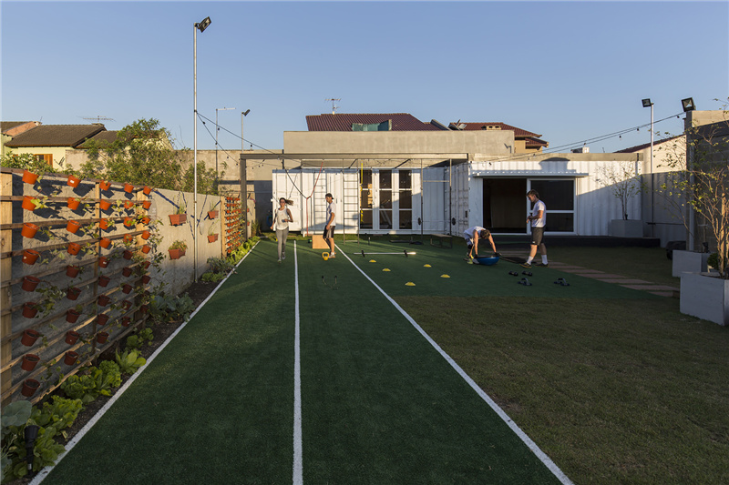 集裝箱在地皮上的布局是經過深刻考慮的,采用橫向封閉,將其中一個藍色容器放置在陸地的極限處,充當阻擋南方強風的屏障。另外兩個容器,一個12m和一個6m(由12m的一個劃分)則位于另外兩個方位,由此構成戶外訓練區域。戶外訓練場已經用天然和人造草處理過,一些運動設施建設在集裝箱前。地下管道可以排出雨水并將這些水存儲在下部的水庫中,以便可以在衛生間、菜園和園林綠化中再利用。其中,菜園就是一面被改造成有機花園的隔離墻。