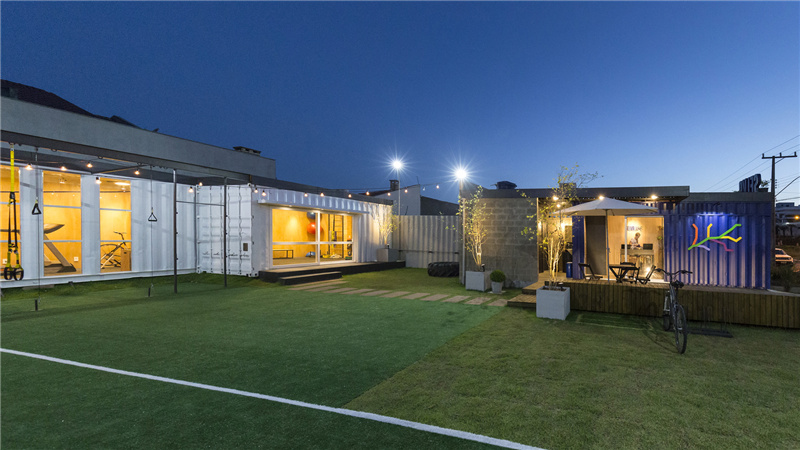 這原本是一片荒蕪的地皮和幾個廢棄的容器,經過活化改造之后變成了一個集裝箱健身中心。選址位于混合的住宅社區中心,旨在讓附近的居民可以了解到健康運動的生活新概念。建筑的最前方首先是一個擁有醒目招牌的商品店,精美的展示櫥窗對外開放,擺放各種運動用品吸引路人的眼球。