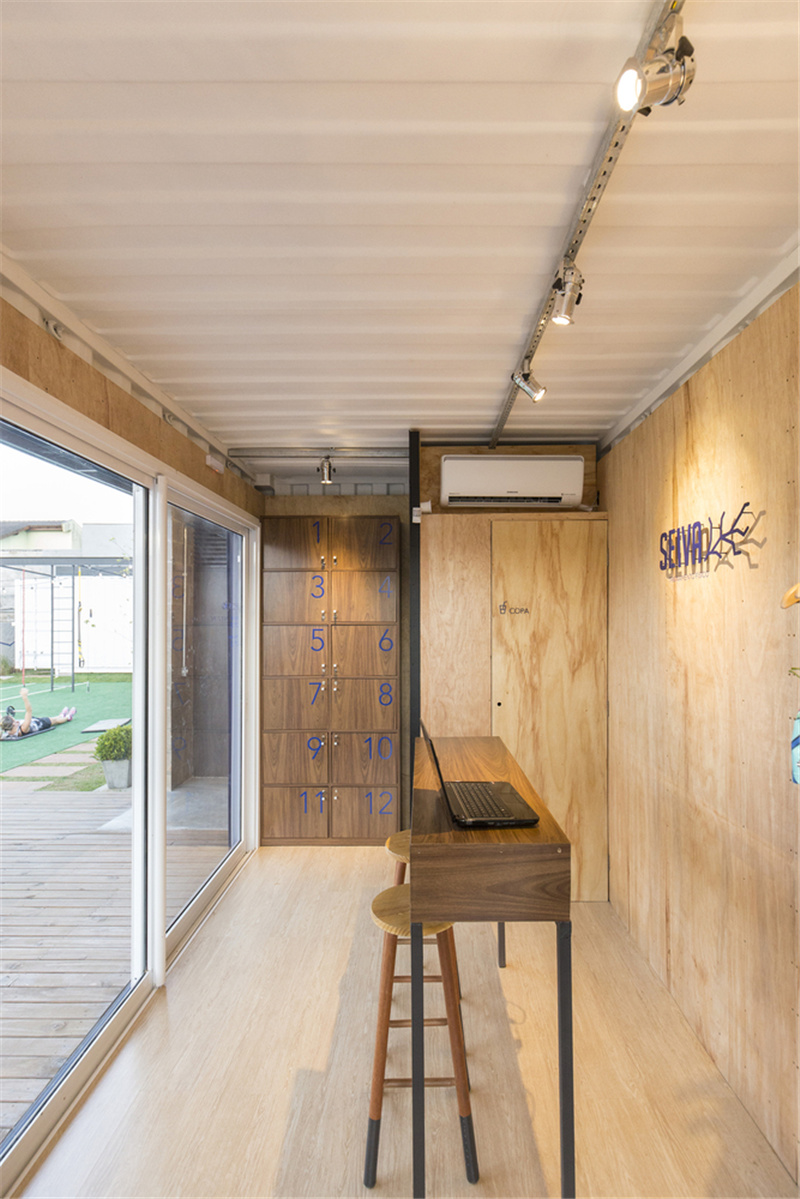 室內裝潢也同樣遵循簡單性原則,容器內部襯有海洋膠合板和植樹造林的松樹,覆蓋生態瓷磚,并用玻璃纖維進行熱防護。電氣裝置全部裸露在天花板上,增強了工業真實性的美學魅力。地面鋪設了泡沫地墊,以增加舒適性。
