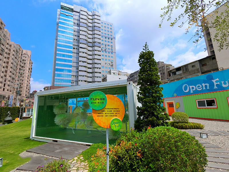 園區(qū)內有一座座集裝箱房打造成有趣的裝置藝術,其中一座純白油漆潑痕點綴堆疊而成的集裝箱屋,是園區(qū)里面的“藝術駐村中心”,而服務臺也位于此處。