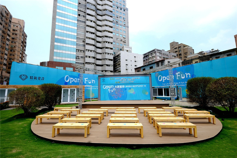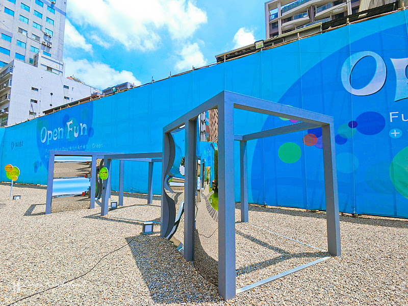 繼續(xù)往前走是一個色彩鮮艷的集裝箱和一堆鐵框,鐵框內鑲嵌上一些反光的材料,將鋼鐵元素玩出無限可能。再過來是一個“鏡子箱”,它們的前方剛好圍成一個露天舞臺,用于舉辦各種不同的藝術活動,一個大草坪實在太適合戶外玩耍了。
