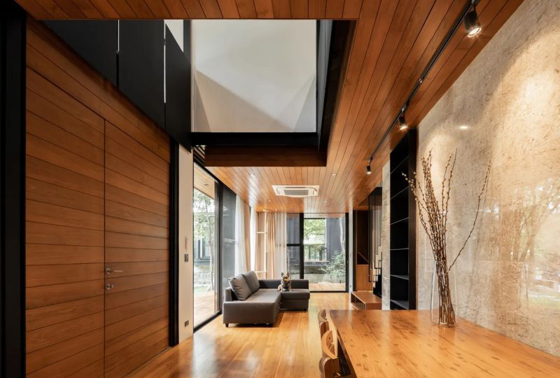 該房屋內大多數樹木的種植時間都在3-4年,因此它們十分結實。負責該房屋項目的建筑公司具有花園設計專業知識,因此通過將露臺和開口連接起來,設法將花園、鐵房和工作室在內的所有東西結合在一起,把熱帶花園的本質融入每一個視圖,使住戶無論是坐在房子前面,還是走到二樓的樹梢附近,都可以透過窗戶看到綠色的空間,感覺就像是插入了紅木和綠植花園的房屋。