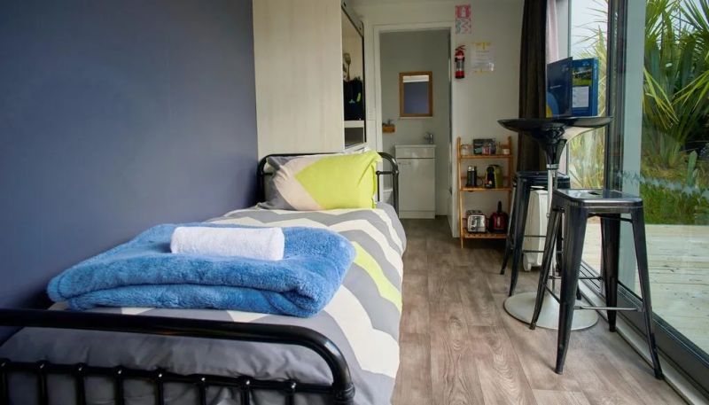 房屋的另一邊是一柜之隔的臥室,一張舒適的雙人床靠墻而設,全透玻璃窗擁有磨砂窗簾,在需要私密環境的時候便可以打開使用。房屋內的軟裝材料都挑選了令人舒適的材質和色調,布置溫馨,讓住戶可以真正享受休息。