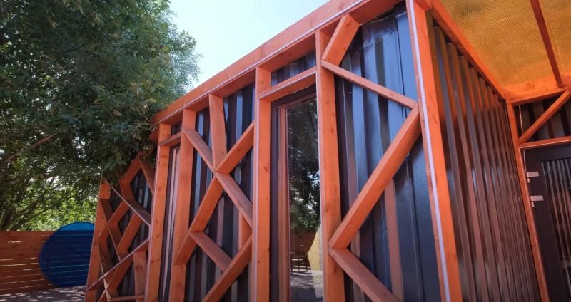 集裝箱房屋的周邊擁有多種休閑娛樂設施,能滿足住客的度假需求。可以看到,這座由40英尺集裝箱改造而成的房屋擁有一個極其時尚的外觀,波浪板壁被線條感十足的木條所覆蓋。整體結構分為兩個部分,房屋入口處擁有一個舒適寬敞的門廊。