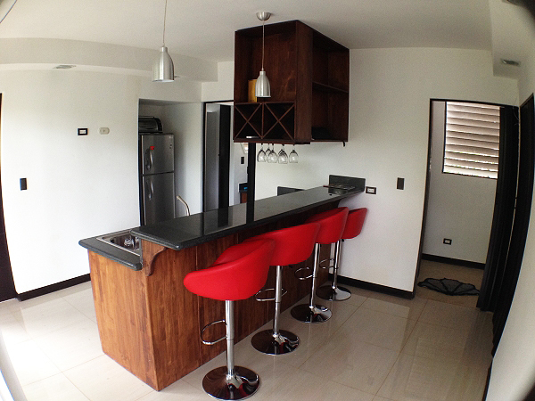 房子中部是公共煮食吧臺,掛壁櫥柜方面收納節省空間。