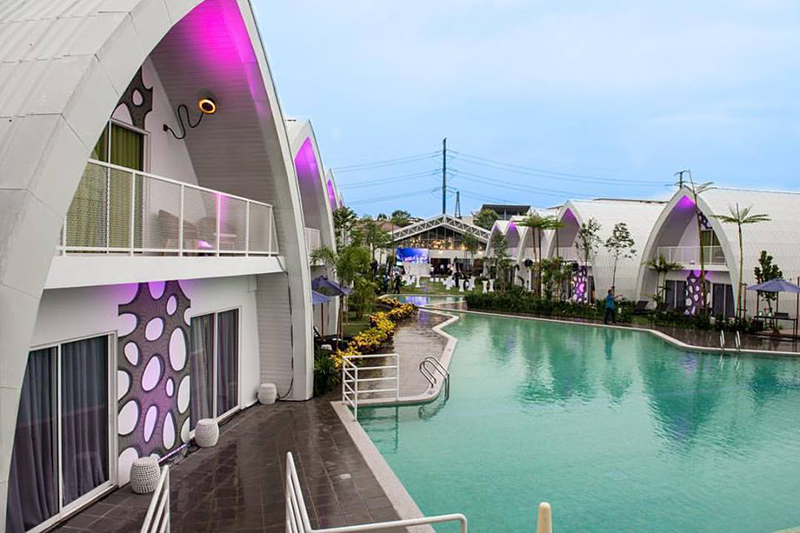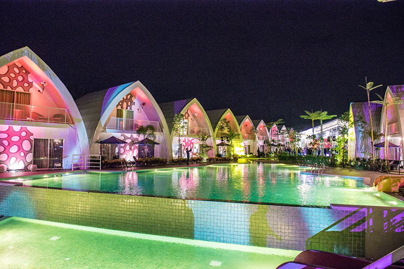 這個酒店的占地面積很大,還有自己的品牌特色。一直巨大的綠色聽歌兔子就是他們的標志,離不開高新科技的光環——電子音樂設備。而這里就是標準的度假區呀!