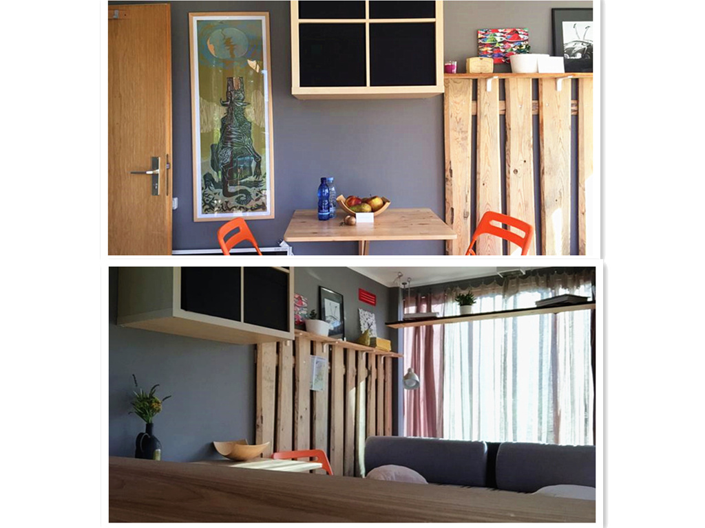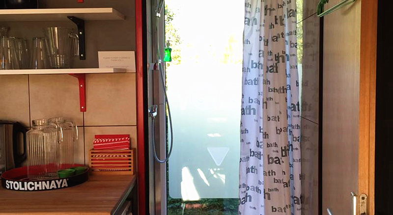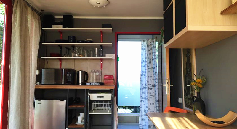休息室位于房屋入門的右側(cè),沙發(fā)床放置在窗邊,陽光透過窗簾照射進來,為原本狹小封閉的空間提供了良好的采光,溫暖舒適。門口左側(cè)的置物柜放置了微波爐、水壺以及各種餐具,旁邊還擺放了木制的桌椅可供使用,客人可以在此就餐。私人淋浴室位于置物柜隔墻的背后,浴室衛(wèi)生間一應俱全。
