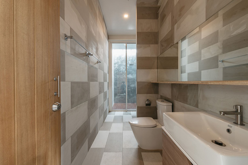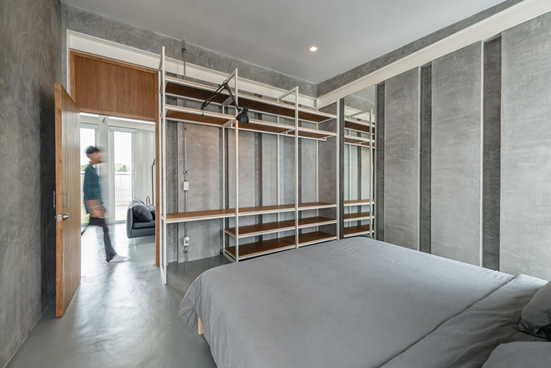 房間的墻壁看似普通的裸露石膏,但其實是模仿容器波紋表面設計的。隱藏在以簡約風格裝飾的簡單木門后面的臥室,里面只有一張床,床和床尾區域的金屬架子,可用于儲物或桌子。以及一個簡約大氣的衛生間。