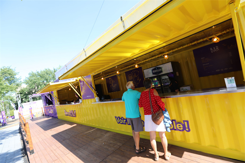 集裝箱被涂上了節日的專屬顏色——黃色和紫色交替出現,門前豎有節日的雕塑牌。你會發現一些集裝箱被“挖”了一個售賣窗口,這其實是影院墻壁的多用。整體來看集裝箱是作為影院的一面圍墻,但細看它卻是一個個獨立的集裝箱商店。