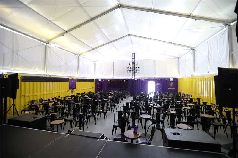 至于影院內就是一個典型的“大棚”,你可以根據影院所需場地的大小增減集裝箱圍墻,成型之后搭建舞臺和燈光,再擺上椅子便是一個功能齊全的影劇院了。