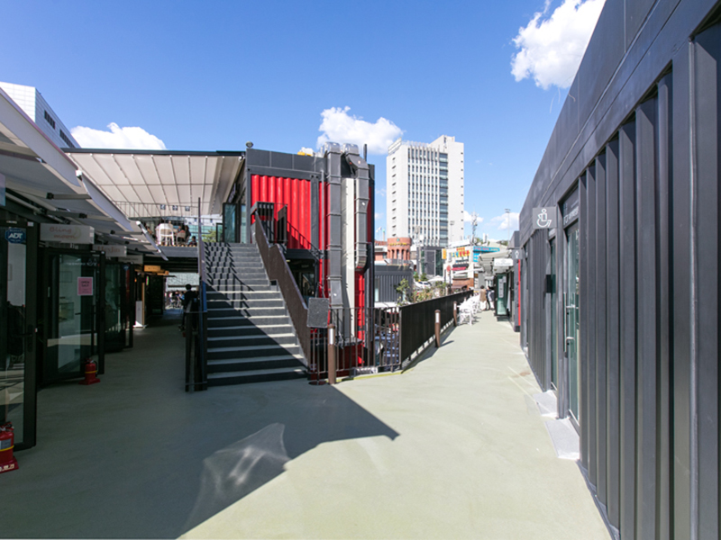 商場整體采用黑色+紅色點綴的外殼,顯得更為低調奢華一些。總共有三層樓,越往上集裝箱數量越少,形成了一座類似金字塔的形狀。商場的中間有一個露天的平臺,以木地板鋪設,提供了一個可以休閑聚會、舉辦活動的地方。