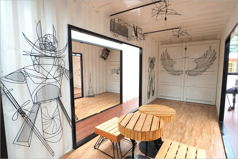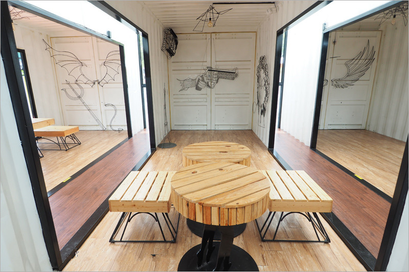 集裝箱內(nèi)采用了大量的木質(zhì)材料和家具,家具采用鐵制的各種造型和木板相結(jié)合,簡約時(shí)尚。建筑內(nèi)部是一個(gè)復(fù)合式的餐廳,兩層都可供客人使用,墻面都畫上了Q版的經(jīng)典人物圖像,游客可以和這些造型各異的圖像拍照留念。除此以外,園區(qū)還有特別的鐵絲藝術(shù)飾品,鐵絲環(huán)繞成不同的物品造型,獨(dú)特吸引。