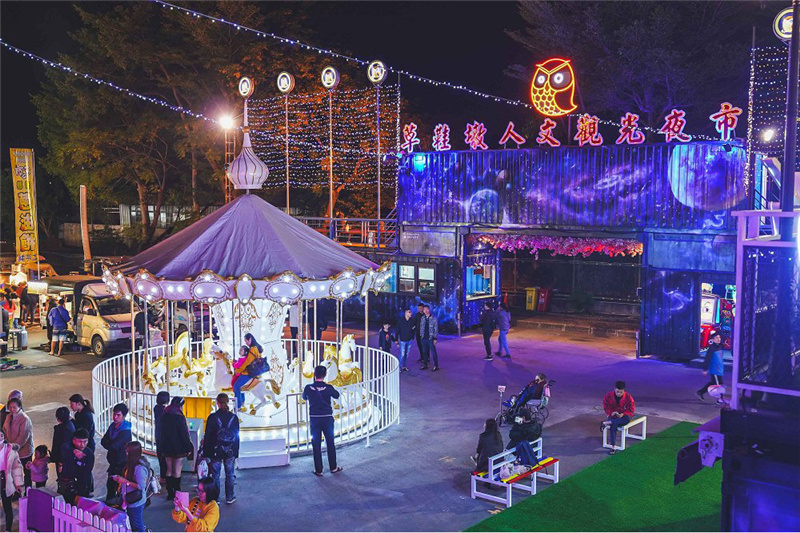 草鞋墩人文觀光夜市就是一個集美食、娛樂、購物、游戲于一體的觀光夜市,每當夜幕降臨的時候,就會有數百家商店點亮拉好的電燈,展示各式商品,人們則在燈光璀璨的景色中逛街購物。草屯貓頭鷹廣場是夜市中的一個小市集,由于炫酷的建筑效果成為了打卡熱點。