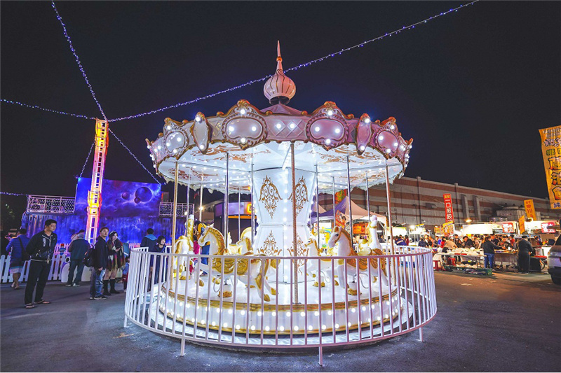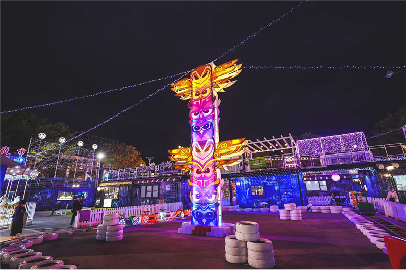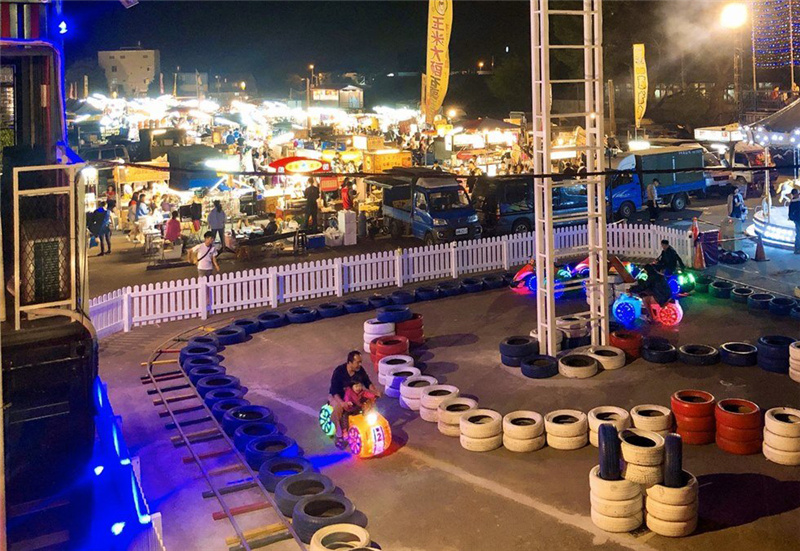 除了炫酷的建筑和多樣的商店,貓頭鷹廣場還設有許多親子游樂設施,比如電動機車、氣墊樂園、旋轉木馬和圣誕主題燈飾等。電動機車的賽道用輪胎圍起,像集裝箱一樣為環境營造著工業感;旋轉木馬雖然不是很大,但白色系加上很多燈泡就變得很浪漫,拍照也非常美。