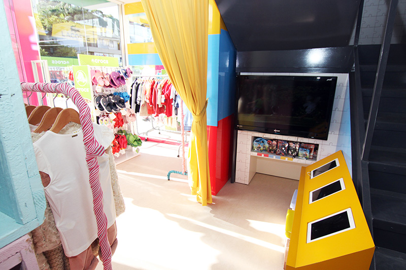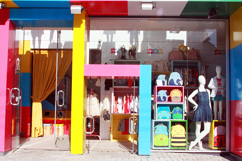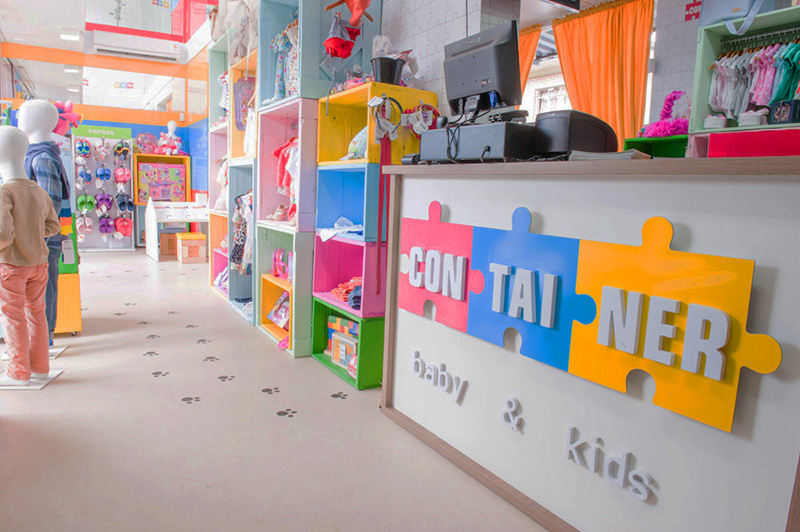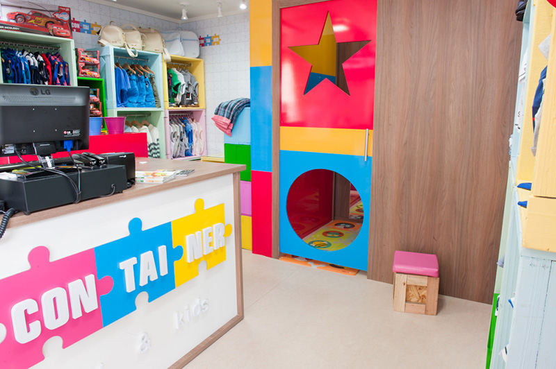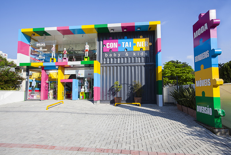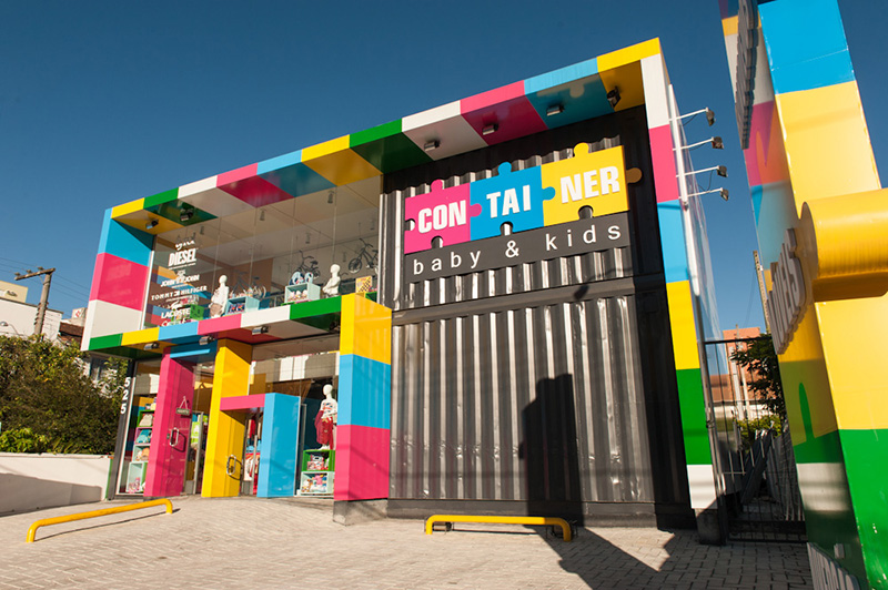 巴西的時尚兒童服裝玩具連鎖店--ConTAINER baby & kids彩色的店面裝潢,簡單明亮的氛圍,加上集裝箱風格的建筑,在同類的兒童用品店中別樹一格。