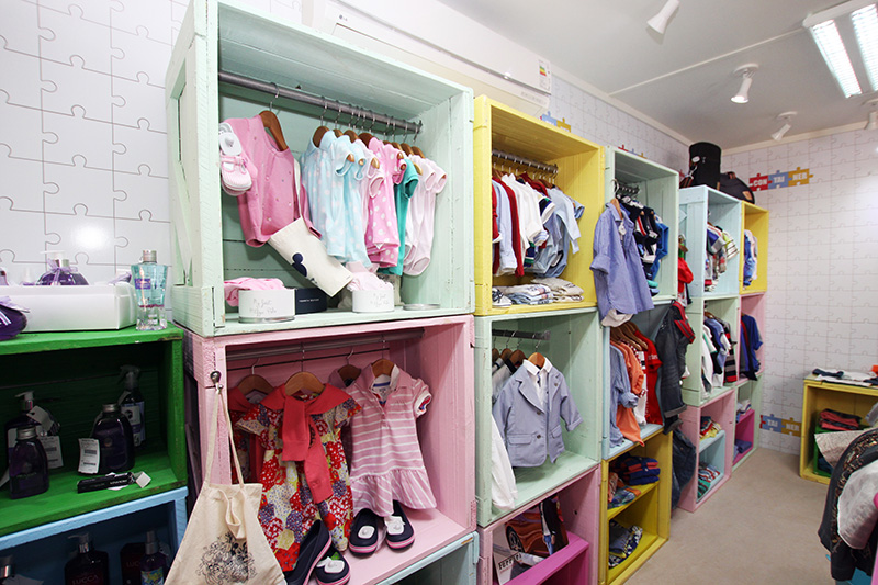 收納箱形狀的衣服展示架,拼圖式樣的背景墻,童趣味十足~!