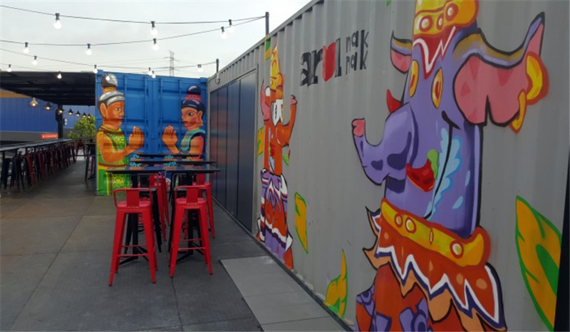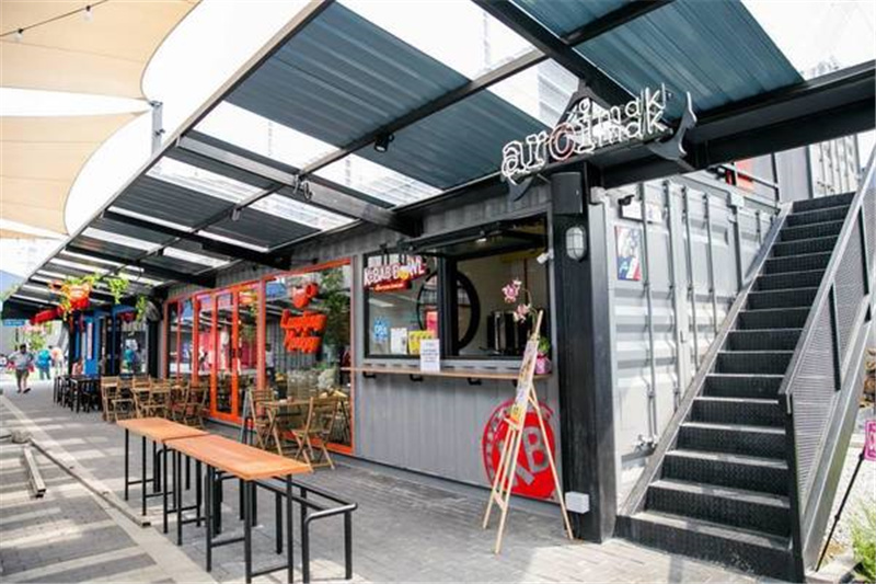 該集裝箱公園內(nèi)建設(shè)了餐飲一條街,各種各樣的小餐館集成在聯(lián)排的集裝箱模塊中,并用不同的外殼顏色區(qū)分不同的店面。街道中間搭建了遮陽(yáng)的頂棚,并放置了休閑的桌椅在走道上,可供游客們休息就餐。