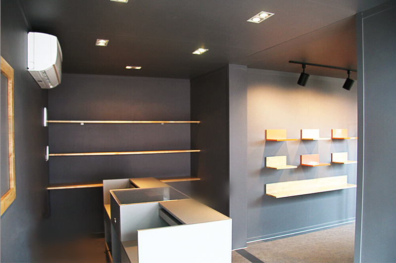 該項(xiàng)目利用了三只20尺集裝箱,橙色的主基調(diào)上搭配不同大小形狀的白色字體,顯得時尚而簡約。室內(nèi)裝修以穩(wěn)重大氣的黑灰色為主,大小各異的陳列架有序地架在墻上。為了保持明亮通透的室內(nèi)環(huán)境,商鋪采用了多塊不同形狀的玻璃(矩形與三角形),能讓自然光到達(dá)室內(nèi)每個角落。
