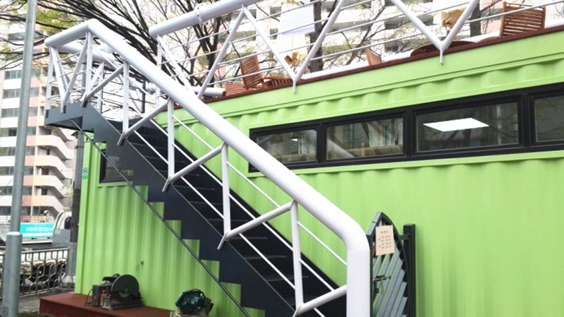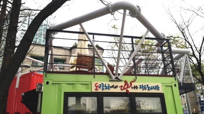 位于韓國的小龍圖書館由三只集裝箱組合而成,綠色集裝箱是由40尺集裝箱組成,是一個借閱圖書的地方;而紅色箱體是由兩只10尺的集裝箱組成,是一個休息室。