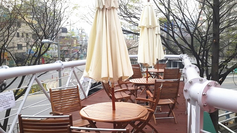 在綠色集裝箱的頂部作了結構加固,并搭建了一個休閑陽臺。棕色的戶外木地板搭配同色系的桌椅,讓人感覺十分親近自然。
