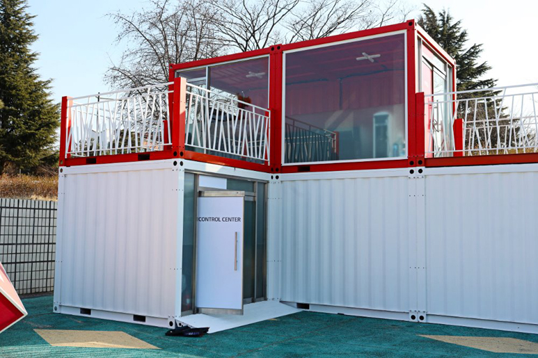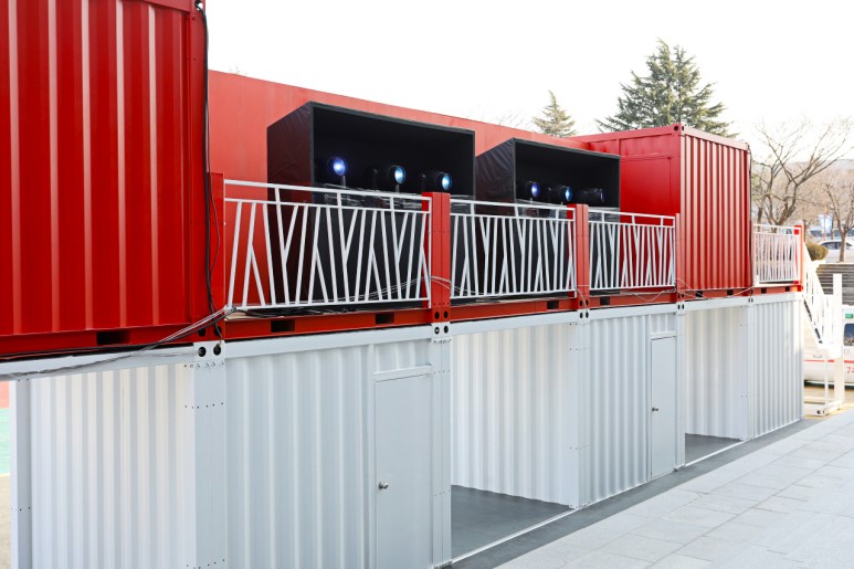 位于廣場另外兩邊的是兩個二層的集裝箱展柜,為現(xiàn)場的人提供演出的咨詢接待服務(wù),也可以在這里歇歇腳。這兩座集裝箱建筑的結(jié)構(gòu)都比較簡單,為的是可以在短時間內(nèi)建成并投入使用。