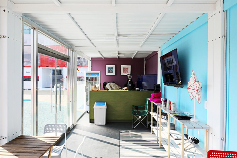 江陵原州大學(xué)是韓國的國立綜合大學(xué),坐落于東海岸的有力地勢,對觀光,環(huán)境,海洋等領(lǐng)域進(jìn)行大力投資。得益于優(yōu)美的環(huán)境,一些展覽和演出會選址在大學(xué)里進(jìn)行。為了方便臨時售票和進(jìn)出場,一些集裝箱建筑被佇立在了這里。