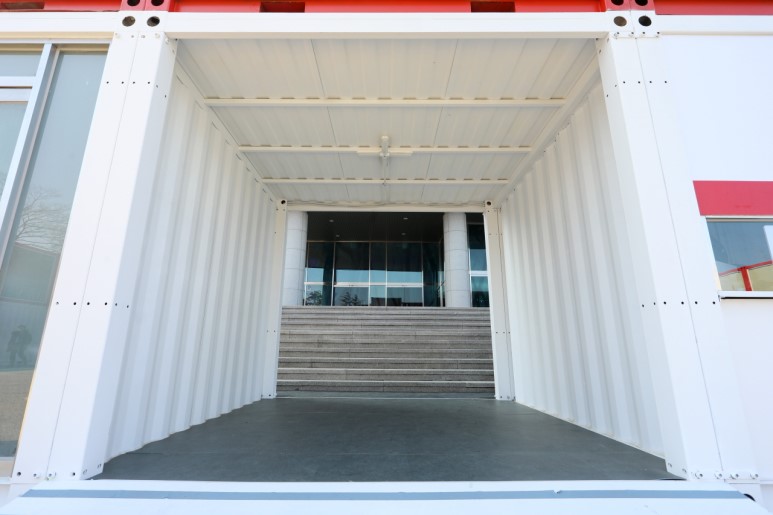 這些紅白相間的集裝箱建筑其實是演出的售票亭和辦公接待廳,現(xiàn)場一共有3個這樣的建筑相互獨立存在,并呈環(huán)繞式擺放在演出館的門前。位于演出館正門處的是拱門式集裝箱建筑,底層的集裝箱間隔擺放,中間預(yù)留的位置可以作為演出館的出入通道,而保留的集裝箱則可以作為售票窗口。