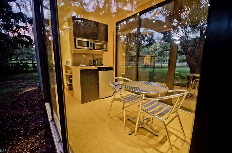 小屋一側的小廚房兼作分隔模塊,一個小桌子和幾把椅子被放在中間,就在兩組窗戶之間。