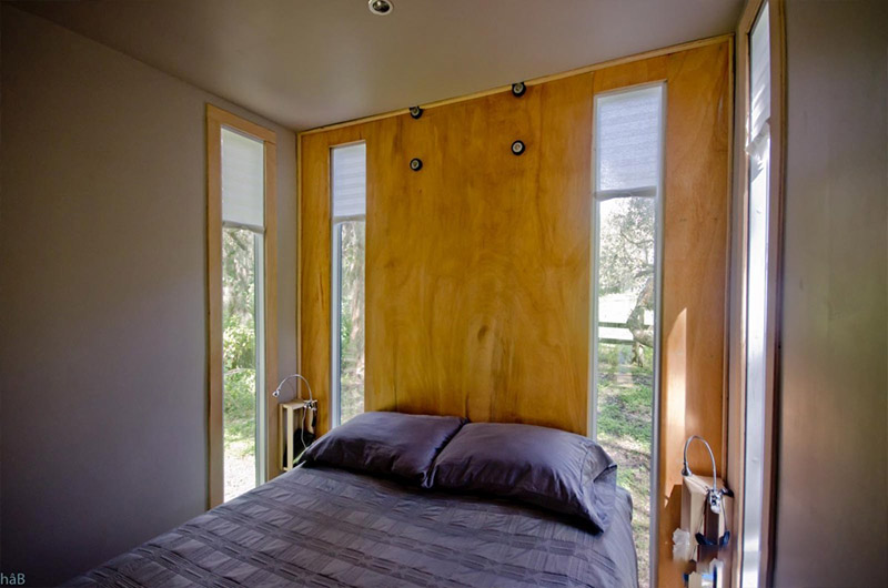 這個小房子的整體風格是現代的,具有強烈的工業外觀。室內設計很好,很簡單。有竹乙烯基地板和淺色調色板與溫暖的木材口音,通風和邀請的感覺。廚房被整合到一個獨立的模塊中,包括吧臺下的一個小冰箱、微波爐、烤面包機和水槽以及相當多的存儲空間。其中一面墻上還掛著一張漂浮的桌子,對面墻上有一個工具儲藏柜,中間有一個小圓桌,里面有幾把金屬椅子。臥室足夠大,可以放一張大號床,還有一些活動空間,浴室里有淋浴、衛生間、一個小梳妝臺和通往衣櫥的通道。