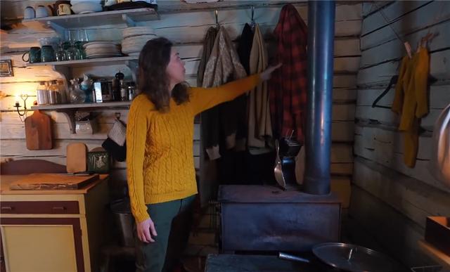 火爐部分,夫妻倆特意做了很多設計,我們一點點說。首先是火爐的主體,其尺寸較大,只要點燃爐火,50㎡的小屋里沒幾分鐘就會暖融融的,爐子上面可以放上水壺,時刻保溫。在火爐后方的位置設有衣架、上方設有手套架,外出衣服沾雪受潮后,只需要掛在這里,不一會兒就干燥如初了。當然,灶具也在一旁的爐子上~一個小小的爐子能實現如此多的功能,贊!