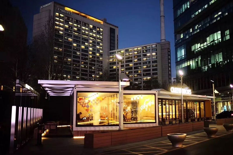 整個餐廳構造由6個集裝箱組裝而成的,因地就勢、造型新穎獨特,占地面積小,前庭后院,提供豐富的戶內外空間。無論是白天還是夜晚,都有著濃郁的時尚現代氛圍。全景落地玻璃,讓就餐的人與街邊路人互為風景,讓人有種仿佛在倫敦街邊的餐館吃飯的感覺。午后,給自己一個空閑,在戶外喝上一杯香醇濃郁的咖啡或一杯桑格麗雅,滿滿的正能量繼續投入工作。