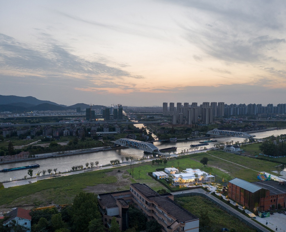 項目選址在蘇州滸墅關地區京杭運河旁的一片平坦的草地上。東側建筑低矮,是民國建筑改造后的蠶里文創園。西側直面大運河,視野開闊。南北向均為草地,自然散落幾棵樹。大運河上的步行雙橋,民國的房子,草地,樹這些建筑和自然的景觀成為一個重要的空間節點,形成特有的場所記憶。