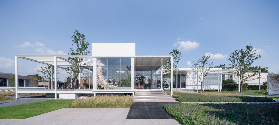 基地內有一棵樹,售樓處采用L形態朝向樹打開,與兩個樣板房體塊圍合出院落,院與樹成為了建筑的視覺中心,整個參觀動線圍繞著院子展開。洽談區作為動線的終點面向大運河展開。洽談區共九個模塊,我們朝向河面方向推出一個模塊,面向運河形成一個凸出的三面臨空的盒子作為茶室。抽離的盒子在洽談區中心留下一個庭院,洽談區圍繞庭院形成內外被自然包裹的流動空間。模型區與洽談區之間增加一個庭院從而保證所有的模塊都能直面景觀,實現內與外的相互滲透。