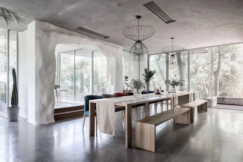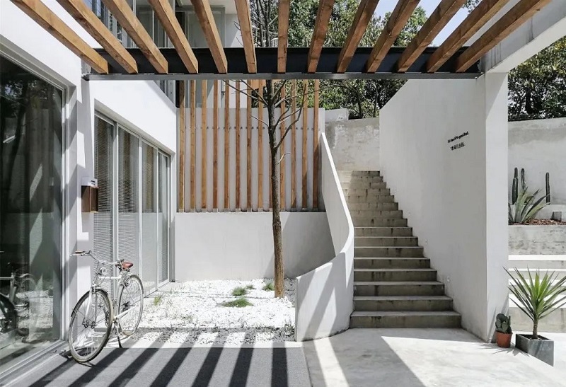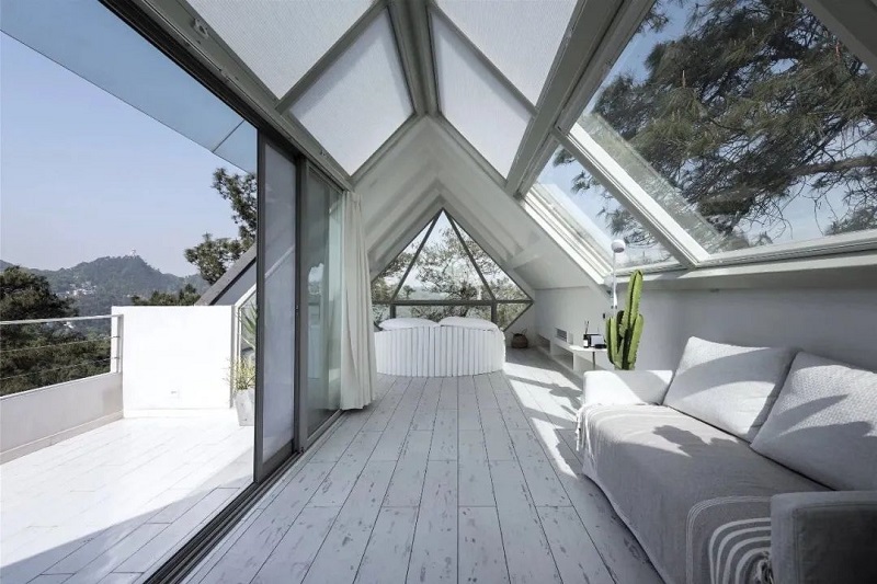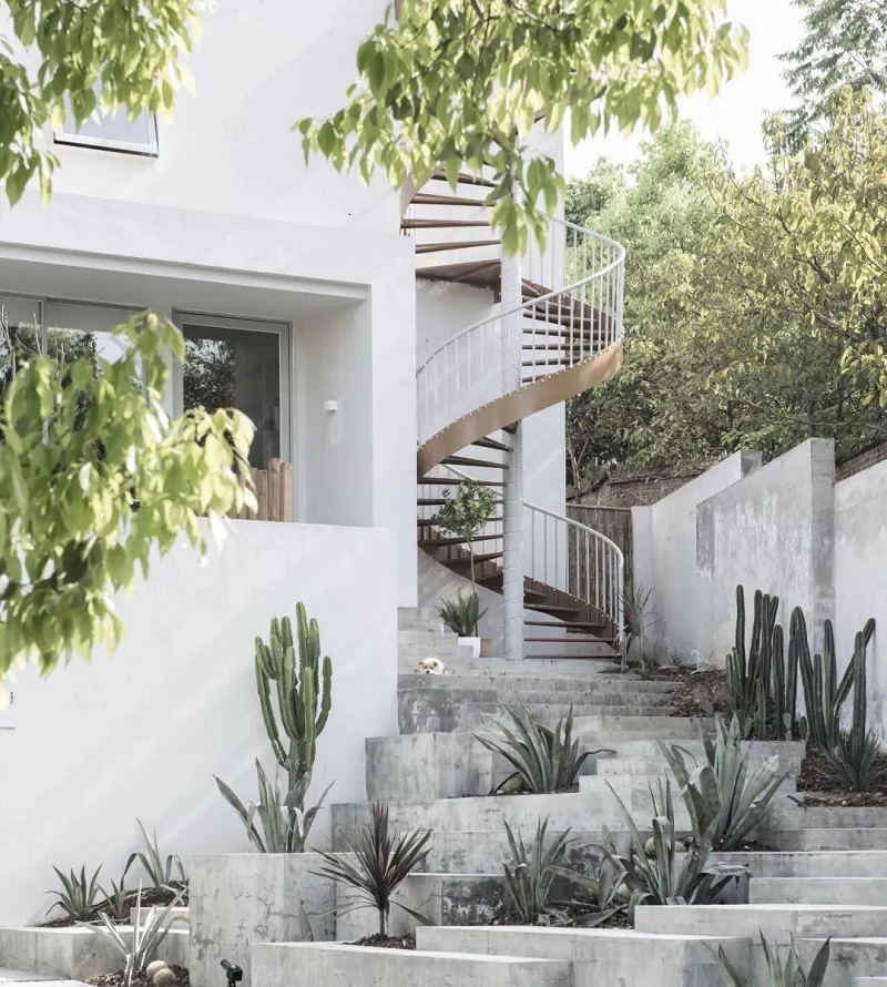松間的空間白凈有趣,從餐廳到天臺鉆石房,一共五層。走近它的時候,映入眼簾的是一棟純凈的白房子和夢幻的旋轉樓梯,底下是錯落有致的水泥色系階梯和仙人掌。從入戶花園開始,設計師便用干凈整潔的建筑結構與錯落趣味的庭院臺階巧妙的融合,環抱的樹木,自然而舒適,天然的環境,作為空間的裝飾,那是再奢侈不過的美景。人與自然、設計之間的關系,就是盡可能的達到一種和諧;在這里,沒有炫技痕跡的設計,所有的一切都好像是在自然空間里生長出來的一樣。