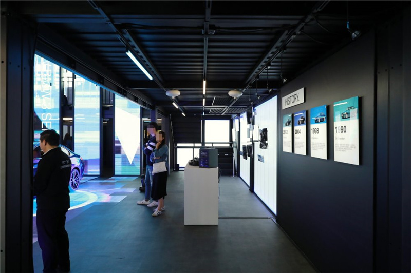 和許多極具科技感的展廳一樣,這座寶馬的展廳也是用了全黑的建筑背景,將室內的燈光效果和車身突顯出來。因此,會發現現場的燈都是以線條。