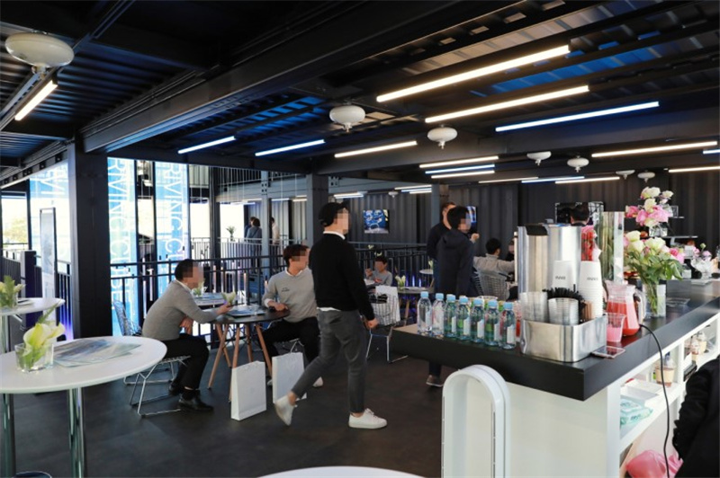 得益于玻璃窗的設計,一些桌椅沿窗而設來客既能看車也能享受優美的周邊景色。但室內的一些墻壁仍然是“銅墻鐵壁”卻為各種發光宣傳欄提供了懸掛的位置,用以展示品牌車型的特色。