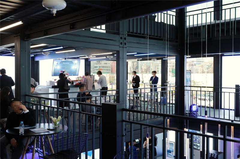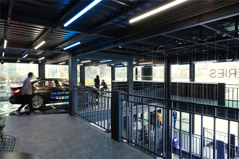 一共三層的室內空間每層的功能都不一樣底下一層主要以展示最新,主打車型為主,第二層則是休閑茶點區,第三層是景色最美的觀景區。樓層之間通過室內的鐵梯進行連接。