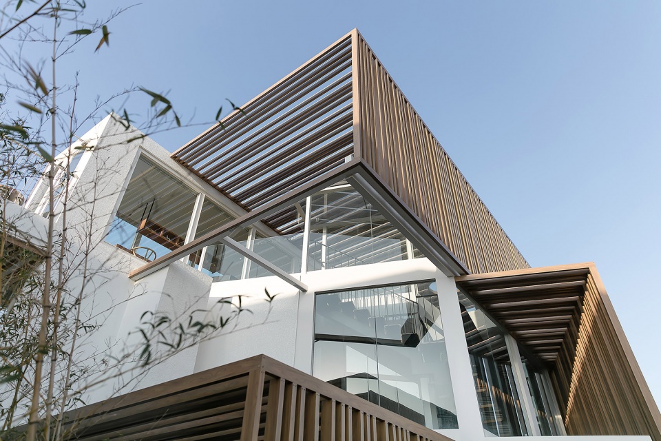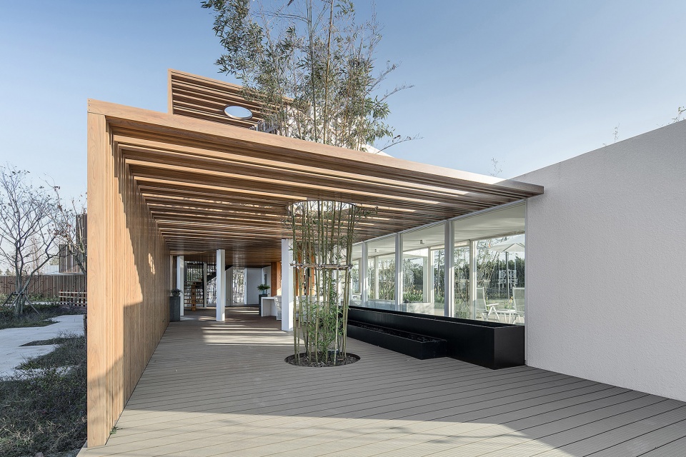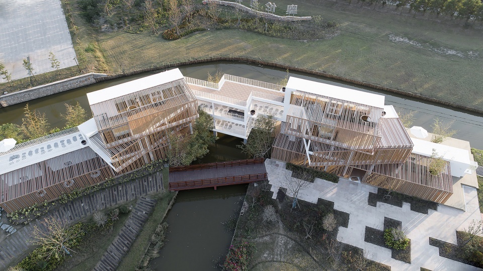 整個(gè)建筑群的顏色由白色和木色構(gòu)成,淺原木色搭配白色給人以干凈,簡(jiǎn)約,現(xiàn)代的視覺感;結(jié)合周邊大地的綠色襯托,使得整個(gè)建筑與自然分外協(xié)調(diào),相輔相成。蜿蜒的河流貫穿整個(gè)建筑的中央,使得建筑群更加充滿靈氣,仿佛潺潺的流水孕育著這些建筑群。